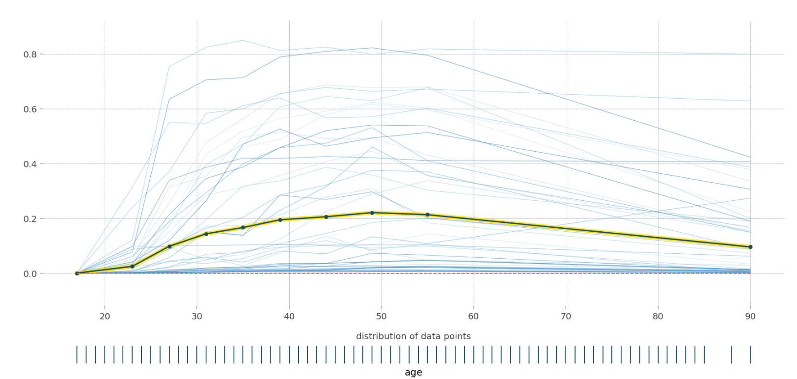 PDP란 ICE plot을 모든 분석단위에 적용한 뒤 그 평균을 낸 것이다. 모델이 해당 특성을 어떻게 분석하고 이해하고 있는지 판단할 수 있다.