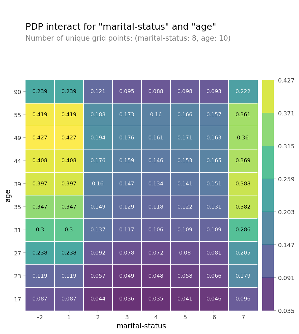 이때 평균선 뿐 아니라 개별 선들을 모두 나타내어 특별한 경우에서의 예측값 변화를 살펴볼 수가 있다. 또 아래와 같이 2개의 특성을 히트맵으로 함께 살펴볼 수도 있다.