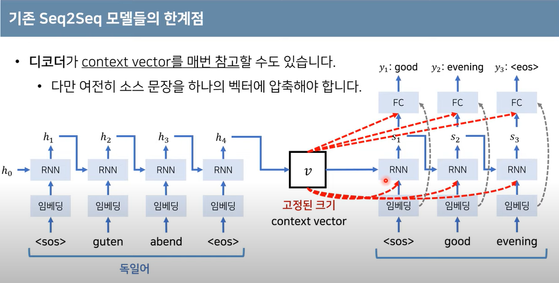 기존 Seq2Seq 모델에는 한계점이 있었다. context vector에 소스 문장의 모든 정보를 압축하기에 병목현상이 발생하는 것이었다. 이는 성능 하락의 원인이 된다.