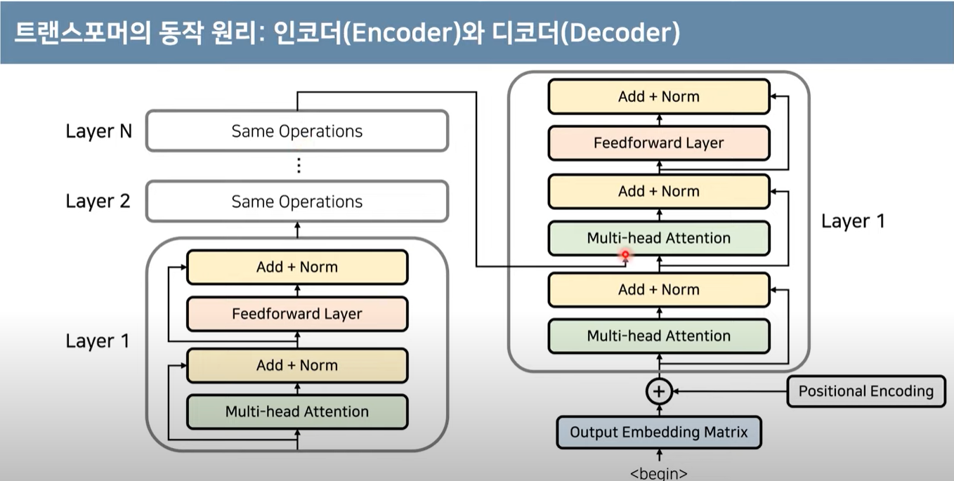 입력값은 매 단어를 생성할 때마다 입력된다. 위 그림의 왼쪽은 인코더, 오른쪽은 디코더다. 디코더도 여러가지 레이어로 이루어져있지만 위 그림에서는 하나의 레이어만 나타나 있다.